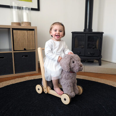 Crafted with a solid wooden frame and rubber-trimmed wheels, Bailey is built to last. His durable frame ensures stability, while the rubber tyres offer excellent grip and smooth movement on hard floors, providing peace of mind for parents and safe play for little ones.