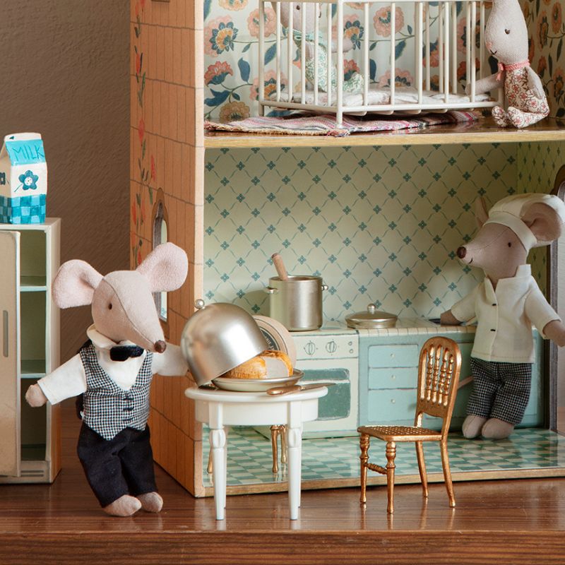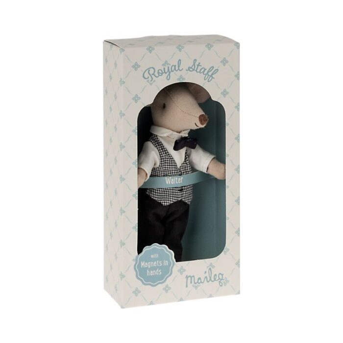 This gorgeous big brother waiter mouse is the perfect helper for your mouse home! He comes dressed in a traditional waiters outfit (very Downton Abbey) and is ready to serve the lady and gentleman of the house. He has magnets in his paws, which makes holding on to utensils and general household items a lot easier. Or perhaps the occasional cup of tea for himself.