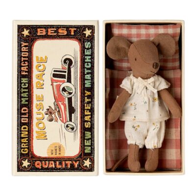 Wearing a gorgeous Maileg unique print pyjamas, this mouse is ready for a good nights sleep in her matchbox which contains a padded mattress, pink checked and padded pillow and a matching pink checked blanket – all to keep her cosy and warm. You can see why she’s loved so much.