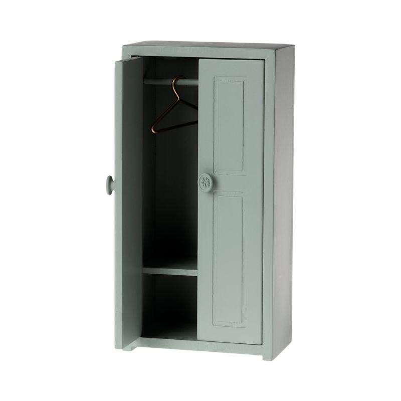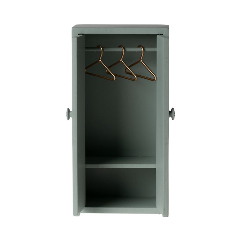 The cream colour of the wooden closet complements Maileg’s palette of soft pinks, blues, and greens, so you can match it to existing furniture or create a pleasant contrast. The golden hangers add a little pop of luxury to the design, making the closet feel extra special. Children will love the idea of giving their mice a sense of order and routine—just like in real life, except on a much smaller scale!