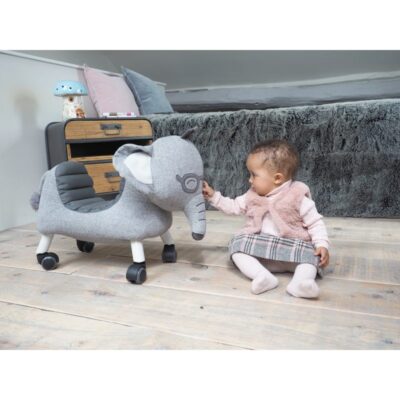 The curved, padded seat is upholstered in a matching grey leatherette, offering a supportive and comfortable ride for little ones. It’s designed to keep toddlers securely seated as they scoot around, and the seat height of 22 cm is perfectly suited for children aged 12 months and older. Beneath Cuthbert’s stylish exterior is a solid wooden frame, built for durability and longevity, ensuring that this ride-on elephant can handle all the adventures your child embarks on.