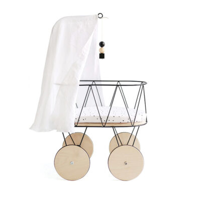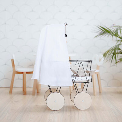 It comes attached to a co-ordinating metal holder and to give it that added touch of class, it has three wooden objects that are strung on white string – something for your child’s dolly or teddy to look at!