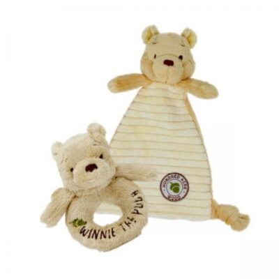 The gift set comprises a wonderfully soft comfort blanket which has been beautifully embroidered with the Hundred Acre Wood logo, and the rattle has Winnie the Pooh embroidered around it and also makes a gentle rattle noise when played with.