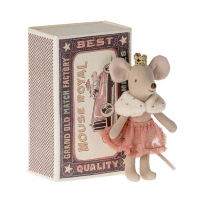 Meet HRH Princess Mouse in Matchbox – she is looking very regal in her tutu with and gold crown (her clothes are removable but not her crown – well, she is a princess). She has her own little bed in a beautifully illustrated matchbox with a comfortable padded mattress, soft floral padded pillow, and a coordinating blanket to keep her nice and warm.
