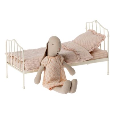 A perfect bed for a good night’s sleep. The metal bed frame is off white in colour and has a gorgeous stripy mattress. The bed linen is made in beautiful Maileg printed fabrics and the gingham blanket and pillow will keep your bunny or rabbit warm and cosy at night. This bed fits bunnies and rabbits in sizes 1 and 2.