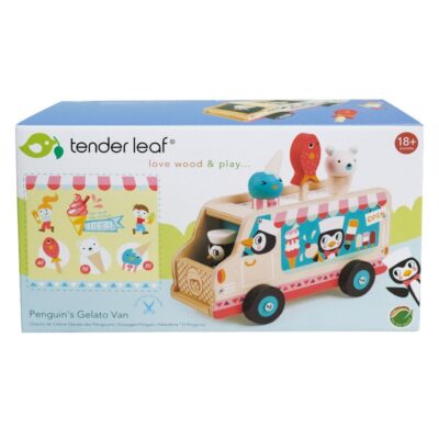 A quirky gelato ice cream van driven by a pesky penguin. Removable lid and 3 sweet ice creams to bring out and stand on top of the roof. Penguin Driver is also removable.