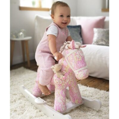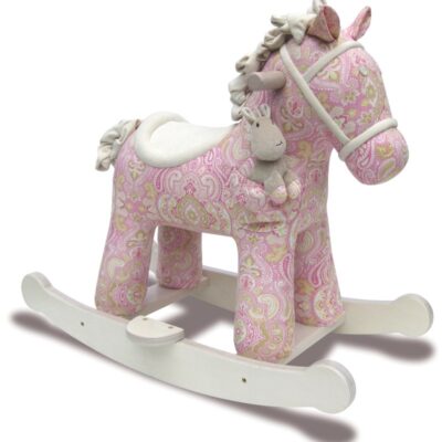 Pixie is adorned in a delightful soft pink paisley print fabric that’s sure to catch the eye and bring a touch of elegance to any nursery or playroom. Her beautifully detailed design is complemented by a sturdy wooden frame, painted in pristine white to add a timeless appeal. The gentle curve of the base ensures a smooth rocking motion, providing a soothing experience for your child while also helping to develop their balance and coordination.