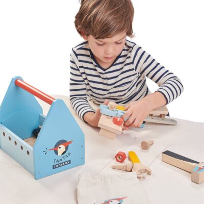 This is a wonderful addition to our ever-popular tool benches collection, a woodpecker themed tool box filled with everything you need to build something on your own. With two removable lid pieces that turn into screwable plates, and a cloth printed bag to pack away after play, this set makes a great gift idea for any child who is a budding creative.